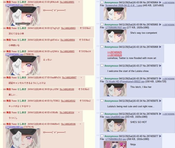 fourth futaba livewatch thread/post episode reaction cause their third one hit 1000 posts in like 5 min: https://may.2chan.net/b/res/1400252400.htm