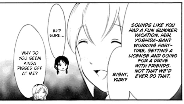 I’M SO HAPPY about this chapter!!! I literally couldn’t have asked for a better set up. Sachi having this degree of banter with Yoshida and the rest of the delinquents is the type of chapter I’ve dreamed about for eons! Mako’s broken state, and Yoshida’s innocence made this my favorite chapter in a while!